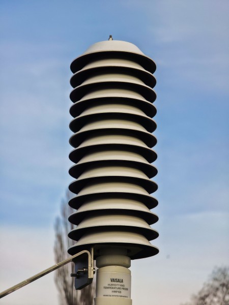 W osłonie radiacyjnej znajdują się czujniki odpowiadające za pomiar temperatury powietrza z dokładnością do 0,1°C oraz wilgotności powietrza wyrażanej procentowo.