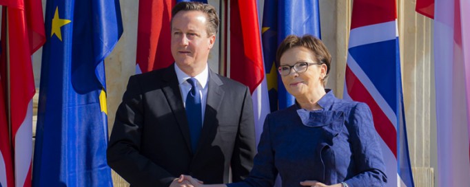 Polish Prime Minister Ewa Kopacz and British Prime Minister David Cameron talk in the Palace on the Island in the Royal Lazienki Museum in Warsaw.
