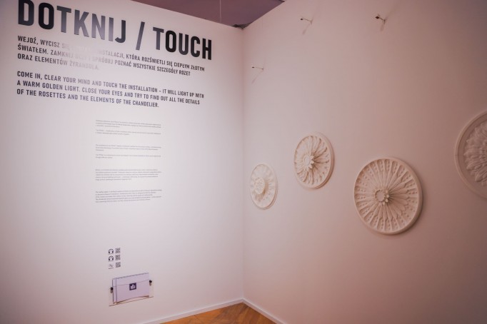 Wystawa czasowa "Łazienki w zachwycie" w Podchorążówce została zaprojektowana tak, aby można było poznawać ją wieloma zmysłami - wzrokiem, słuchem, dotykiem i węchem. Wyjątkowym punktem wystawy jest instalacja Jana Pfeifera "Zobaczyć niezauważalne", czyli rekonstrukcje ornamentalnych rozet z pałacowych sufitów, wykonane w technologii druku 3D i wzbogacone o elementy świetlne. Zwiedzający mogą dotykać wypukłych ornamentów i detali żyrandola z Antyszambru w Pałacu na Wyspie, które po kontakcie rozświetlają się ciepłym, złotym światłem. Artysta zaprasza do odkrywania sztuki nie tylko oczami, lecz także przez dotyk i wyobraźnię.