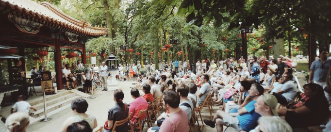 • Ogród Chiński w Łazienkach wieczorem, oświetlony latarniami, wokół stoją ludzie i słuchają muzyki.