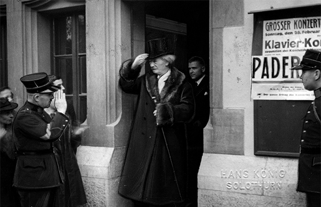 Ignacy Jan Paderewski opuszcza salę koncertową po swym koncercie w Solurze (Szwajcaria), 1937