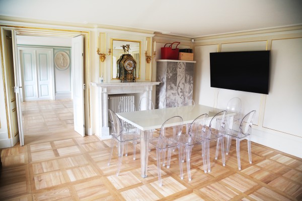 Przestrzeń edukacyjna to niewysokie, jasne pomieszczenie, doświetlone czterema oknami wychodzącymi na łazienkowskie ogrody oraz wgłębnik za Białym Domem. Ściany zdobią złocone obramienia. Sala jest wyposażona w stół z krzesłami dla 10 osób oraz ekran.