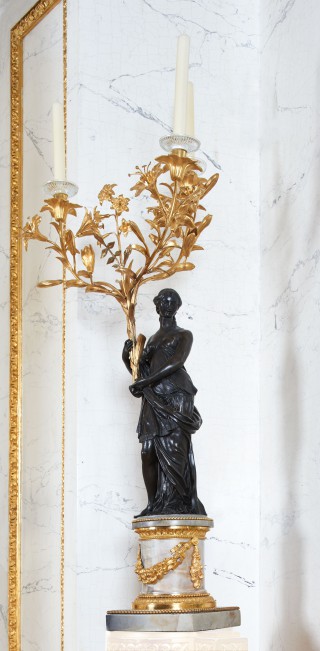 Aplika jest kopią wykonaną przez PKZ ok.1959 r. wg oryginalnych aplik zamówionych przez Stanisława Augusta w Paryżu ok. 1764-1775 r. Komplet 10 sztuk zdobił w 1776 r. Sypialnię króla w Pałacu na Wyspie. W czasie okupacji niemieckiej 4 apliki zaginęły. Zostały zrekonstruowane w okresie odbudowy.