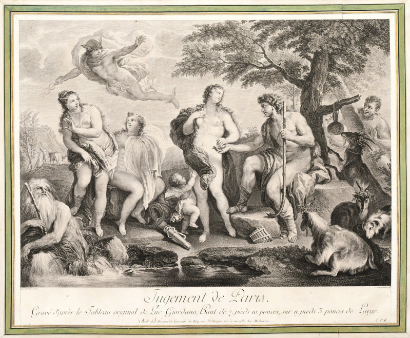 - u dołu, pod kompozycją, po lewej: Luc Giordano pinx; po prawej: J. Beauvarlet Sculp.; pośrodku: Jugement de Paris. | Gravé d’après le Tableau original de Luc Giordano; Haut de 7. pieds 10. pouces, sur 11 pieds 3 pouces de Large. | A Paris chez Beauvarlet Graveur du Roy, rue S.t Jacques vis-à-vis celle de Mathurins.; w prawym, dolnym rogu: C. P. R