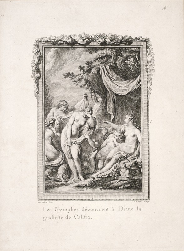 - u dołu, pod kompozycją, po lewej: Ch. Eisen inv.; po prawej: N. Le Mire Sculp.; pośrodku: Les nNymphes découvrent à Diane la | grossesse de Calisto.